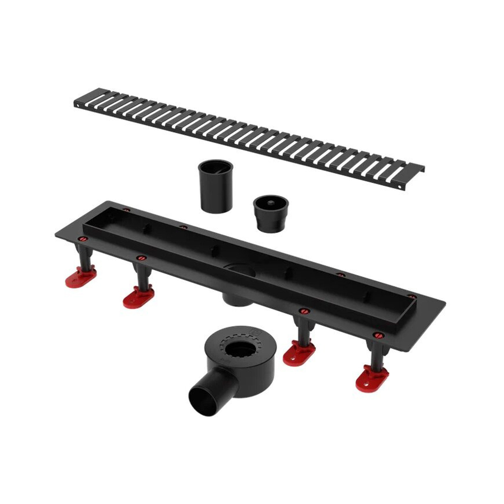 Трап линейный ТП-55D-600 решетка из нерж. стали "Полосы"с гориз. вых.D50 мм рамка из пластика ЧЕРНЫЙ