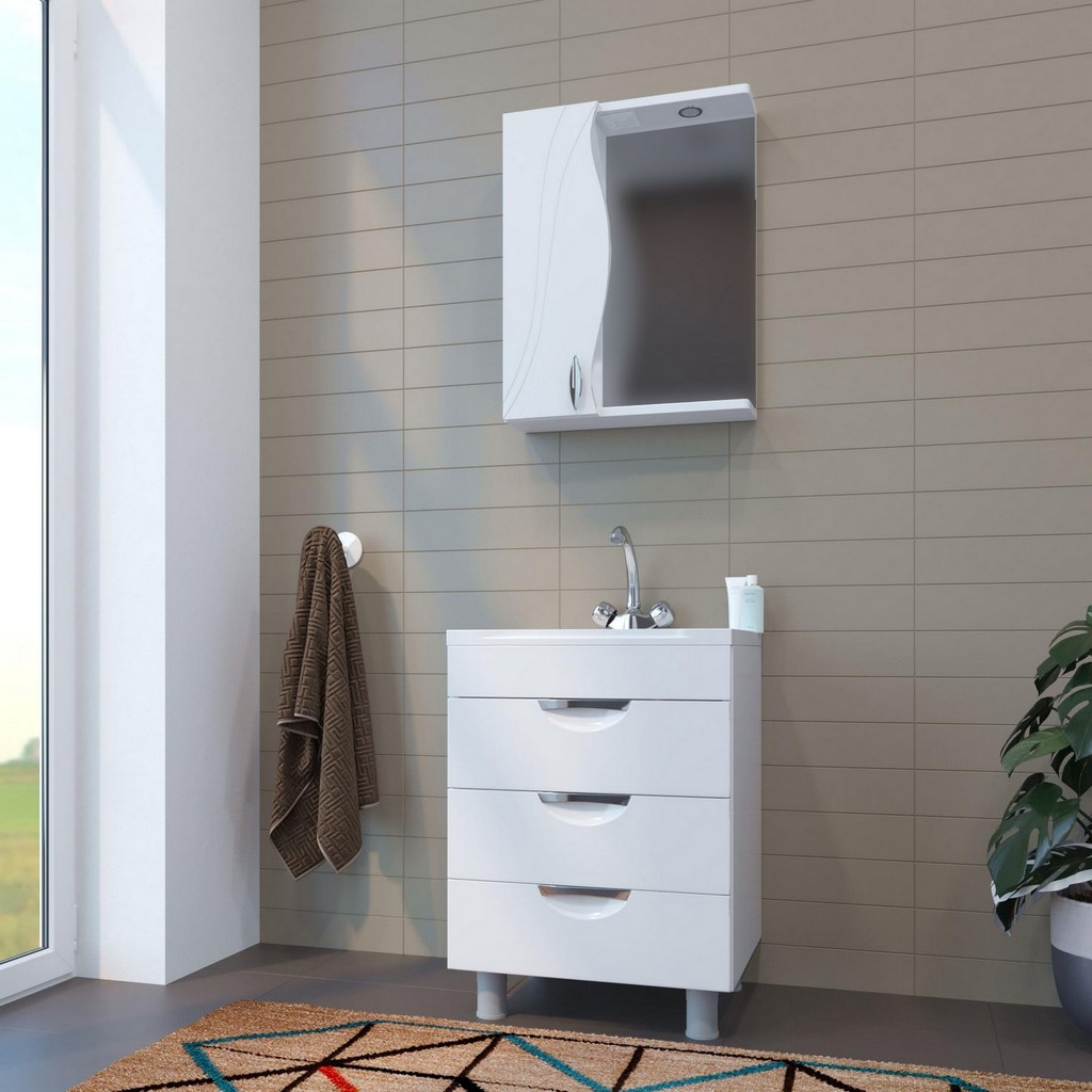 Комплект мебели предназначен для небольших ванных комнат. Изящные вьющиеся линии, украшающие фасады мебели, придадут ванной легкость, а тщательно продуманная конструкция и организация внутреннего пространства позволяет навести порядок даже в небольшой ванной комнате.Комплектация - ручка (металл) - 1, полка - 2, полкодержатель - 8, подсветка