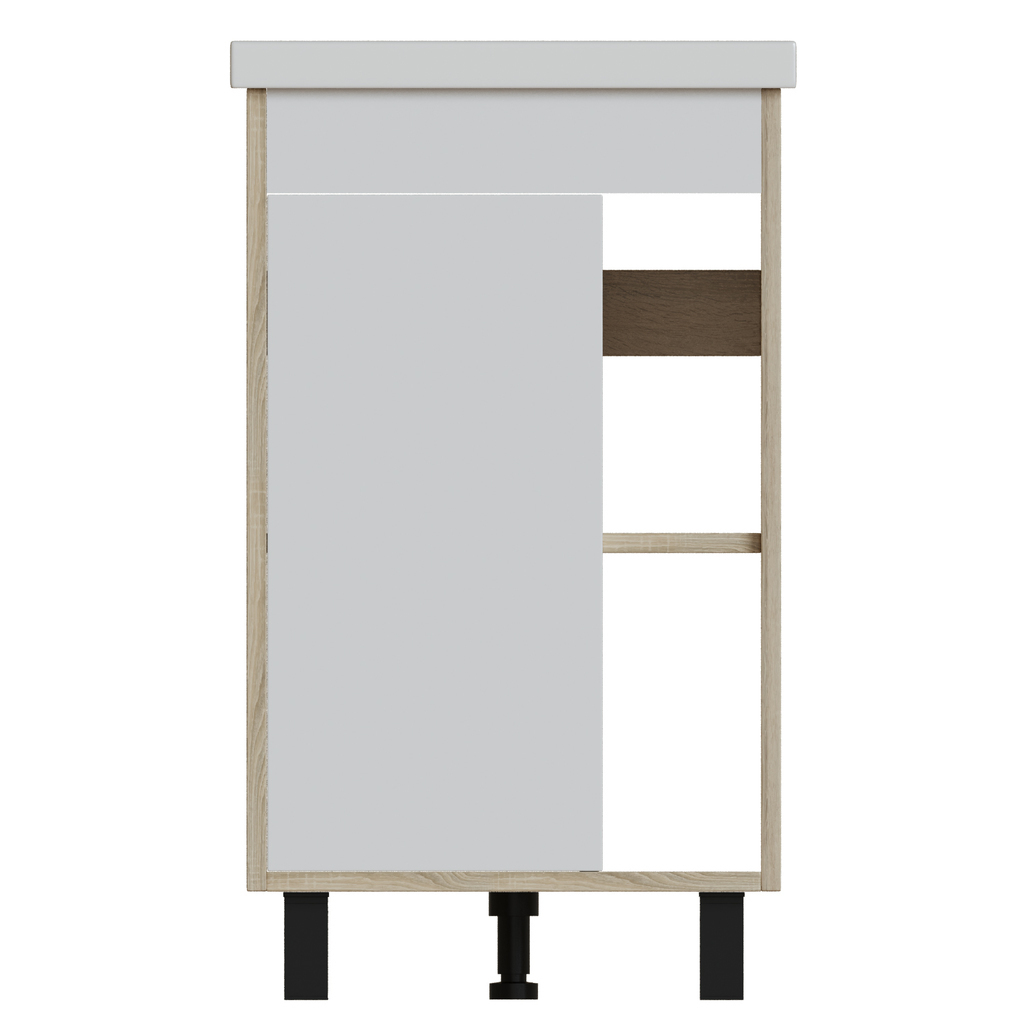 Напольная тумба с одной распашной дверцей и открытыми нишами для хранения. Внутри полка из ЛДСП. Петли на дверце оснащены доводчиками. Дверца тумбы изготовлена из МДФ и облицована белой матовй пленкой ПВХ белый софт. Корпус тумбы изготовлен из влагостойкого ЛДСП. Тумба устанавливается на четыре регулируемые опоры и фиксируется к стене при помощи креплений.