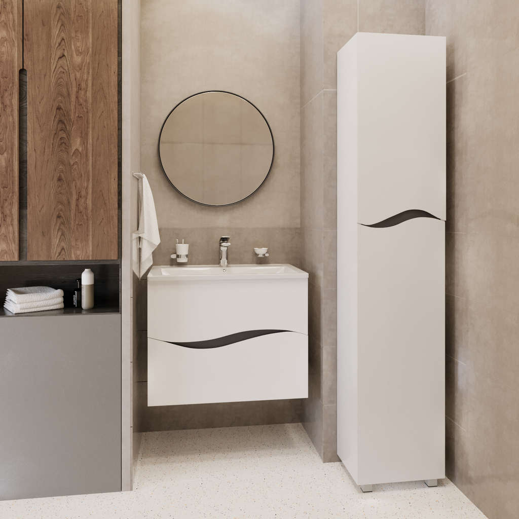 Коллекция "Лайф" - это эстетичная и практичная мебель с изящными волнообразными элементами. Глянцевый фасад в сочетании с контрастным островком добавляет мебели стиля и оригинальности. Интересно исполненные края ящиков также выполняют функции скрытых ручек.Коллекция представлена подвесными и напольными тумбами, а также вместительным пеналом. Ширина тумб позволяет комфортно обустроить как небольшие, так и просторные ванные комнаты.