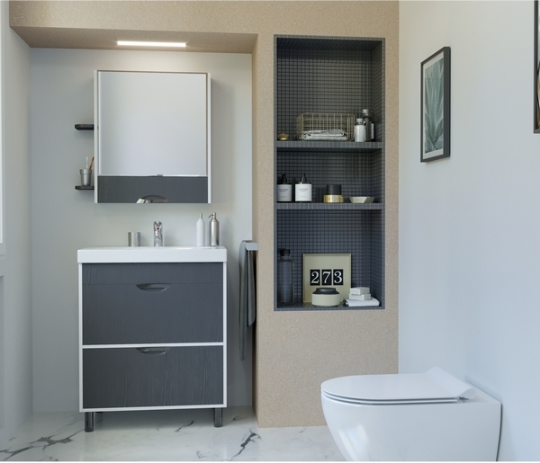 Геометрия лаконичных фасадов украсит помещение ванной комнаты и сделает его строже и гармоничнее. Современная фурнитура грамотно раставляет акценты и зрительно вытягивает пространство. Качественные механизмы обеспечивают плавность хода дверцам шкафа и ящикам тумбы. Продуманная эргономичность и вместительность позволяет расставить все по своим местам в ванной комнате.Комплектация - ручка (металл) - 1,полка - 3