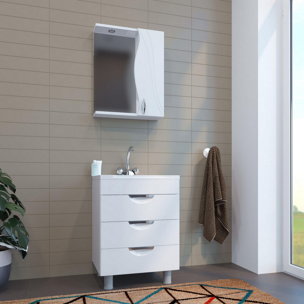 Комплект мебели предназначен для небольших ванных комнат. Изящные вьющиеся линии, украшающие фасады мебели, придадут ванной легкость, а тщательно продуманная конструкция и организация внутреннего пространства позволяет навести порядок даже в небольшой ванной комнате.Комплектация - ручка (металл) - 1, полка - 2, полкодержатель - 8, подсветка