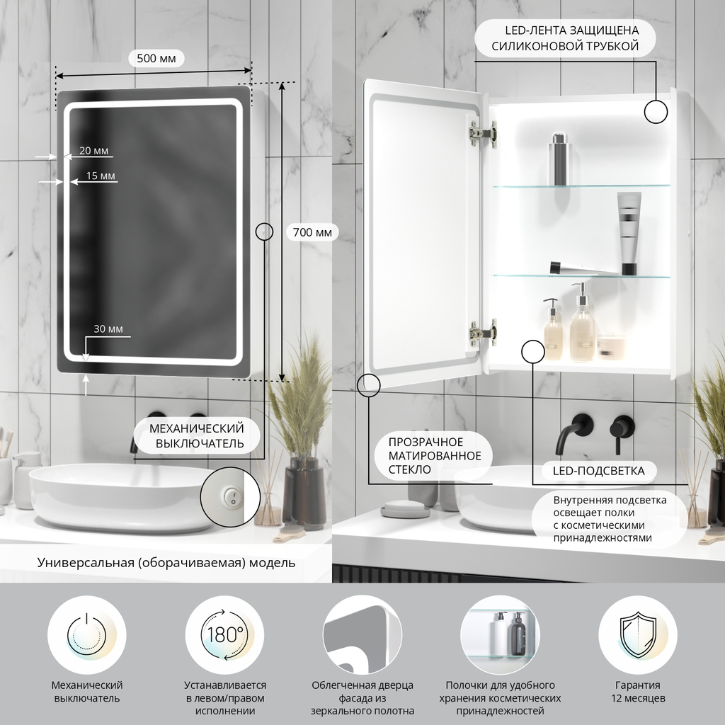 Зеркальный шкаф MIXLINE "Симпл" 500*700 (ШВ) универсальный,механический выкл., светодиодная подсветк