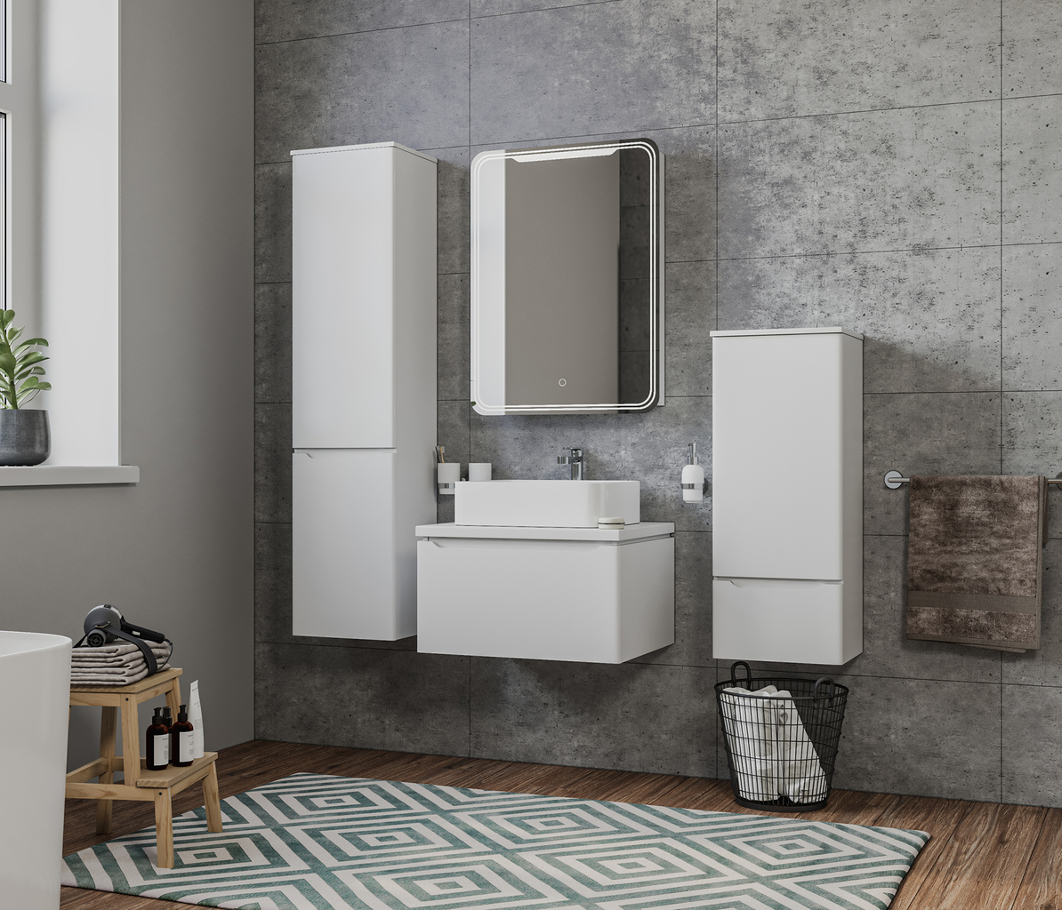 Зеркало Виктория или зеркальный шкаф со светодиодной подсветкой и сенсорным выключателем создают единый гармоничный ансамбль с минималистичной мебелью тм Mixline.