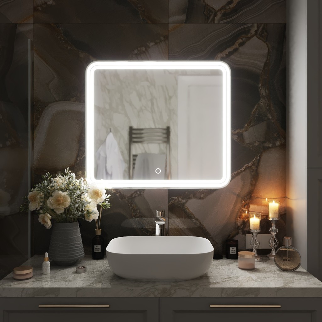 Настенное зеркало для ванной Mixline с подсветкой 80 х 70 см изготовлено из зеркального полотна толщиной 4 мм.Оснащено сенсорным выключателем и диммером, который при удержании пальца на сенсоре позволяет менять интенсивность освещения. Свет белый (холодный 5800К - 6300К). Срок службы диодов - 100 000 часов.