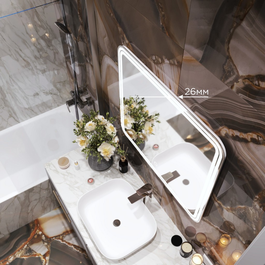 Современная светодиодная подсветка с влагозащитой IP20-IP33 обеспечивает не только эффектное освещение, но и надёжную работу в условиях повышенной влажности. Для изготовления продукции мы используем материалы высокого качества - серебряное влагостойкое зеркальное полотно от AEK (AGC Glass Russia - российская ветвь AGC Glass Europe).