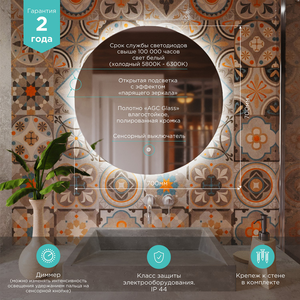 Зеркало MIXLINE "Алон круг" - ЭКОНОМ D700 светодиодная подсветка, сенсорный выключатель