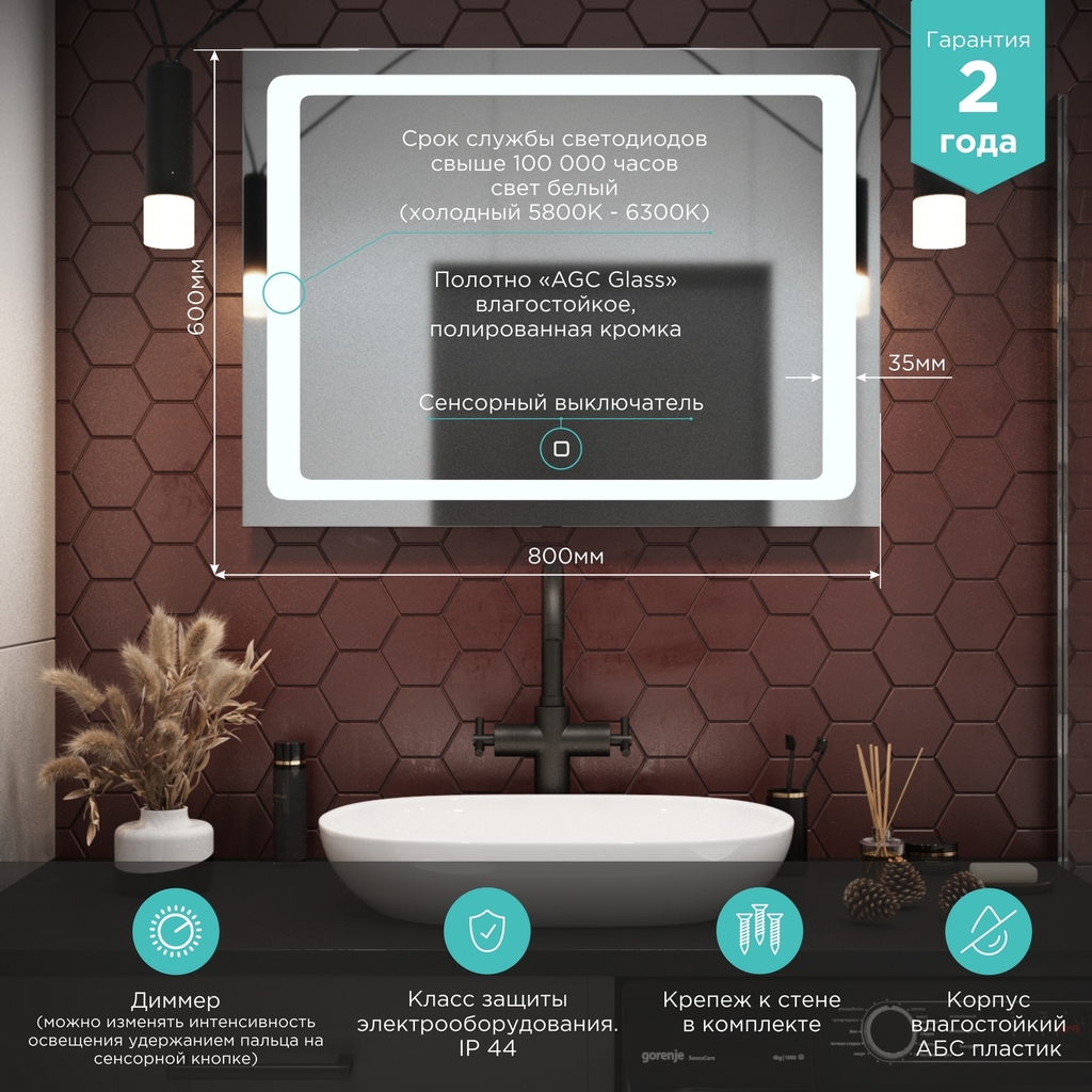 Настенное зеркало для ванной Mixline с подсветкой 80 х 60 см изготовлено из зеркального полотна толщиной 4 мм.Оснащено сенсорным выключателем и диммером, который при удержании пальца на сенсоре позволяет менять интенсивность освещения. Свет белый 6000К. Срок службы диодов - 100 000 часов.