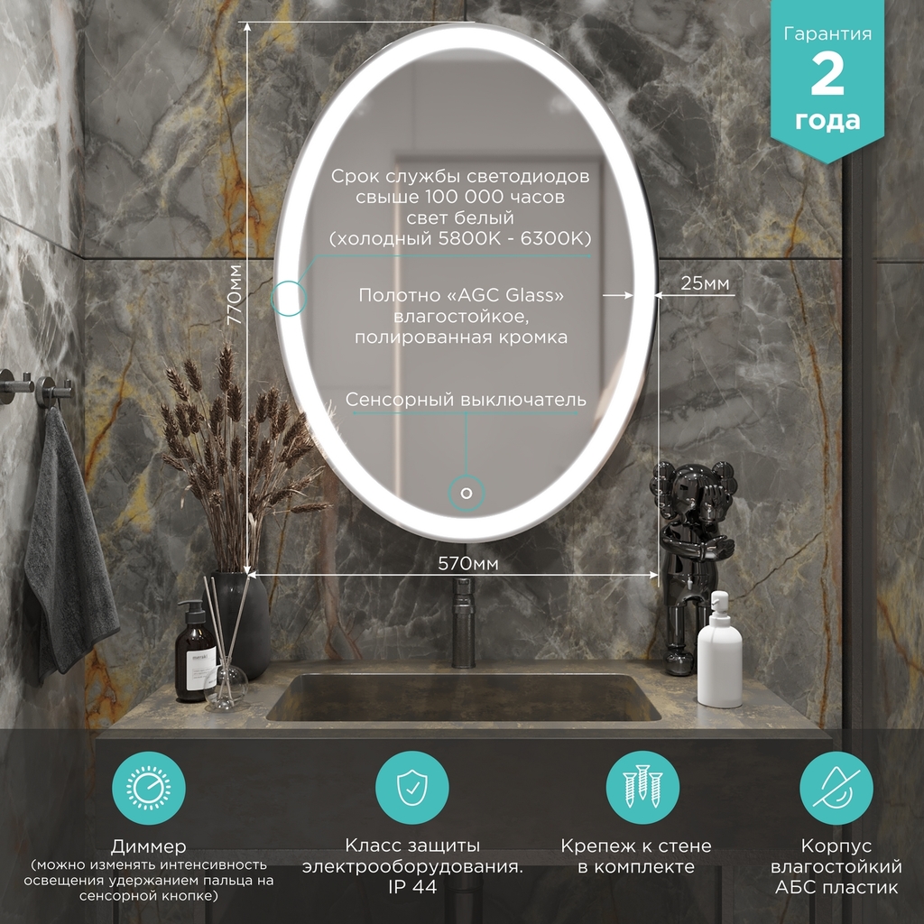 Настенное зеркало для ванной Mixline с подсветкой 57 х 77 см изготовлено из зеркального полотна толщиной 4 мм.Оснащено сенсорным выключателем и диммером, который при удержании пальца на сенсоре позволяет менять интенсивность освещения. Свет белый 6000К. Срок службы диодов - 100 000 часов.