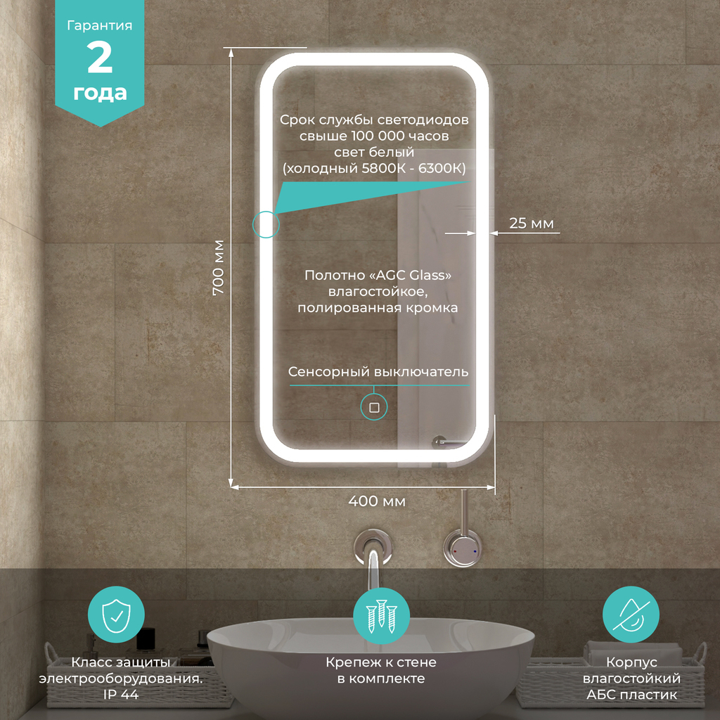 Зеркало MIXLINE "Мальта" 400*700 (ШВ) сенсорный выключатель, светодиодная подсветка