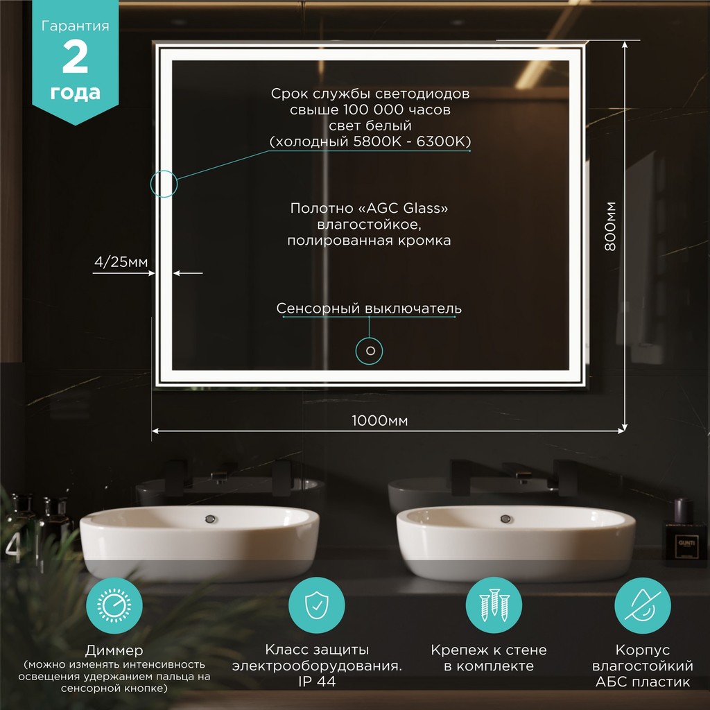 Современная светодиодная подсветка с влагозащитой IP20-IP33 обеспечивает не только эффектное освещение, но и надёжную работу в условиях повышенной влажности. Для изготовления продукции мы используем материалы высокого качества - серебряное влагостойкое зеркальное полотно от AEK (AGC Glass Russia - российская ветвь AGC Glass Europe).