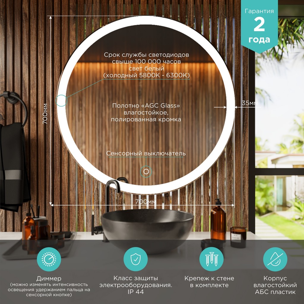 Настенное круглое зеркало для ванной Mixline с подсветкой D 80 см изготовлено из зеркального полотна толщиной 4 мм.Оснащено сенсорным выключателем и диммером, который при удержании пальца на сенсоре позволяет менять интенсивность освещения. Свет белый (холодный 5800К - 6300К). Срок службы диодов - 100 000 часов.