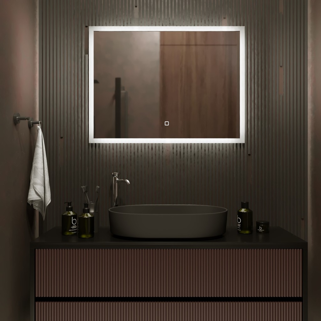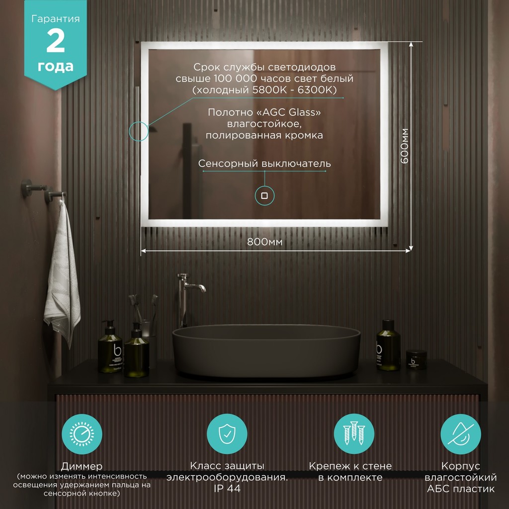 Настенное зеркало для ванной Mixline с подсветкой 80 х 60 см изготовлено из зеркального полотна толщиной 4 мм.Оснащено сенсорным выключателем и диммером, который при удержании пальца на сенсоре позволяет менять интенсивность освещения. Свет белый 6000К. Срок службы диодов - 100 000 часов.