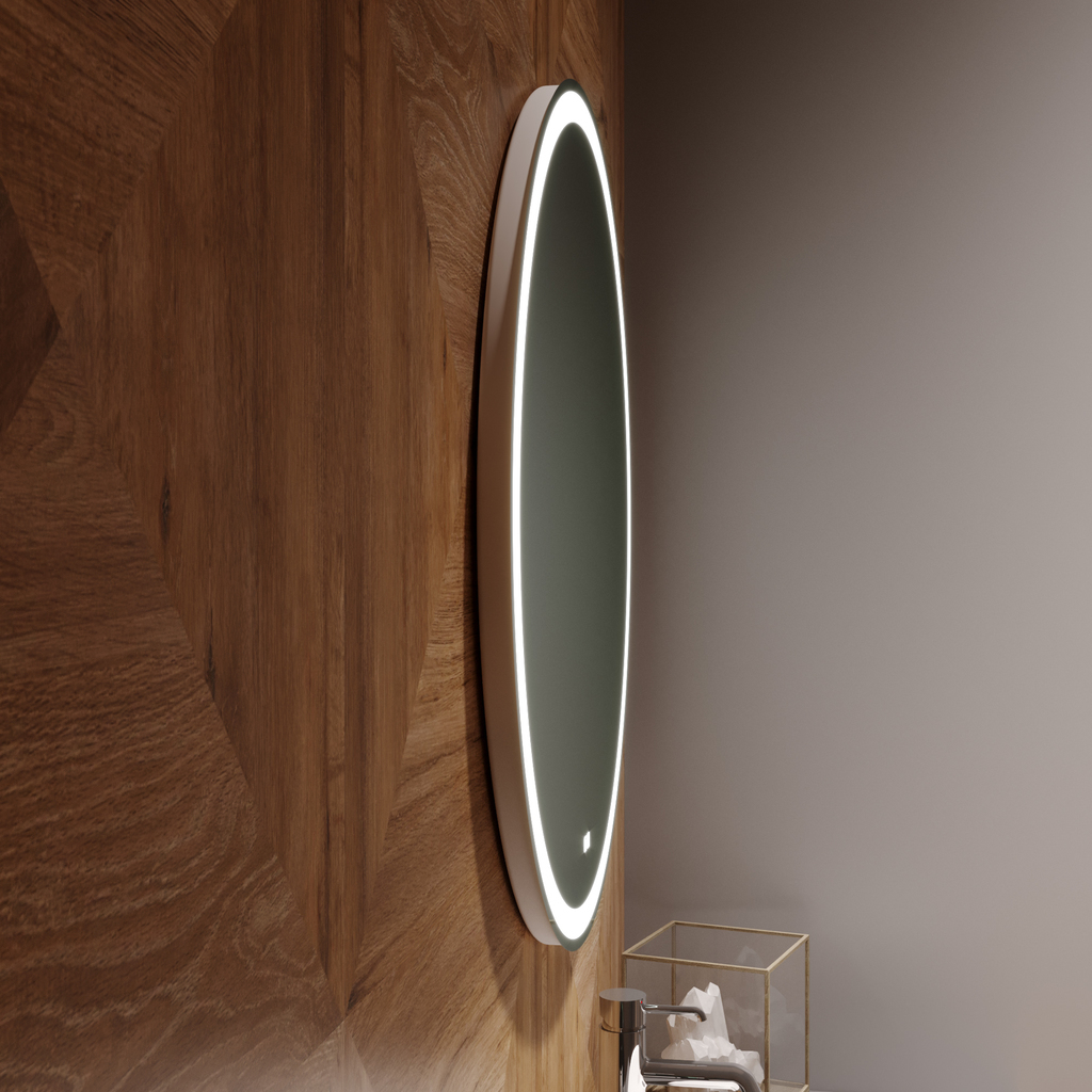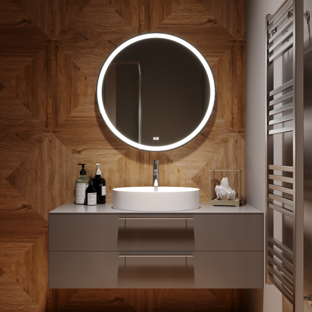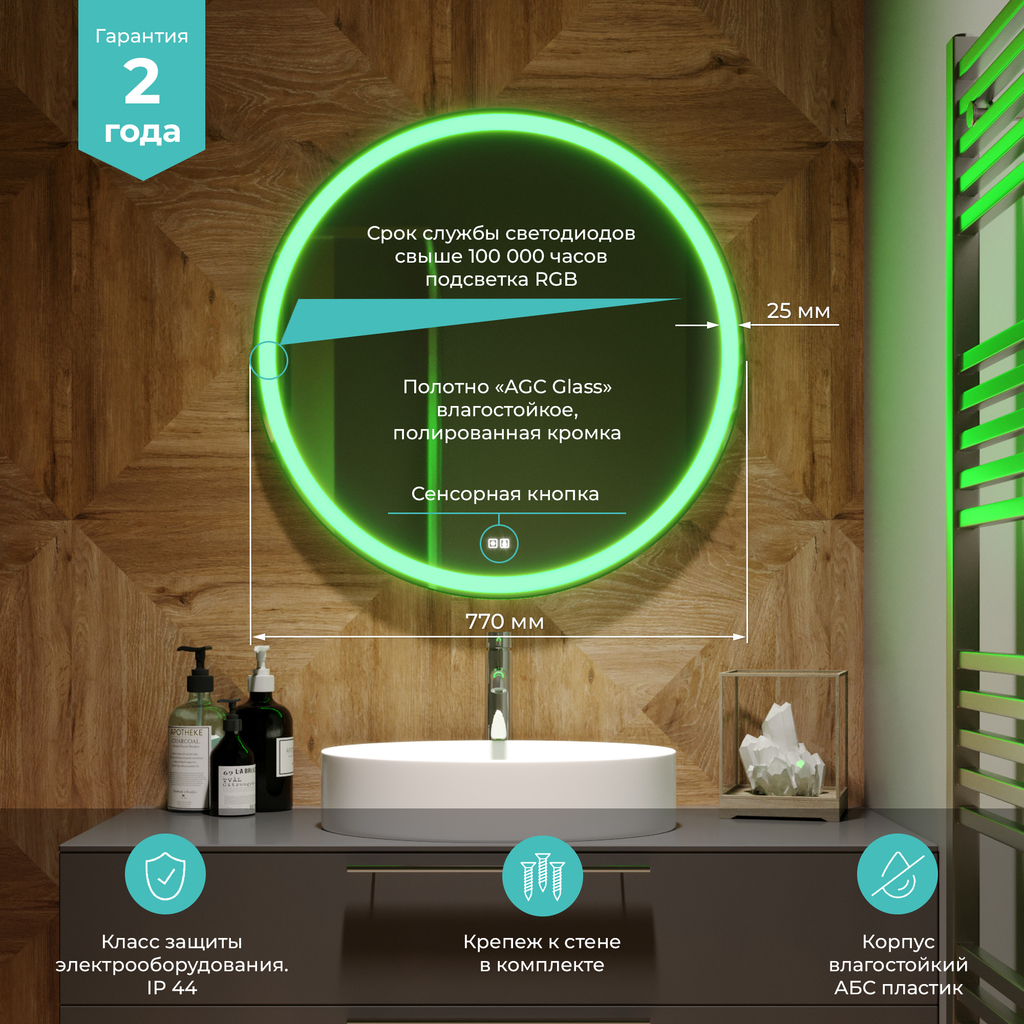 Круглое зеркало с RGB-подсветкой как нельзя лучше подходит для современного лаконичного интерьера: простого, функционального контемпорари, холодного минимализма, монохромного пространства. Идеальная форма круга — олицетворение гармонии и движения — сама по себе смягчит «стерильный» интерьер и придаст ему динамики. А любой из сценариев RGB-подсветки, управляемой сенсорным выключателем с функцией диммера, станет стильным акцентом: цвет жизненно необходим любому сдержанному пространству.Современная светодиодная подсветка с влагозащитой IP20-IP33 обеспечивает не только эффектное освещение, но и надёжную работу в условиях повышенной влажности. Для изготовления продукции мы используем материалы высокого качества - серебряное влагостойкое зеркальное полотно от AEK (AGC Glass Russia - российская ветвь AGC Glass Europe).