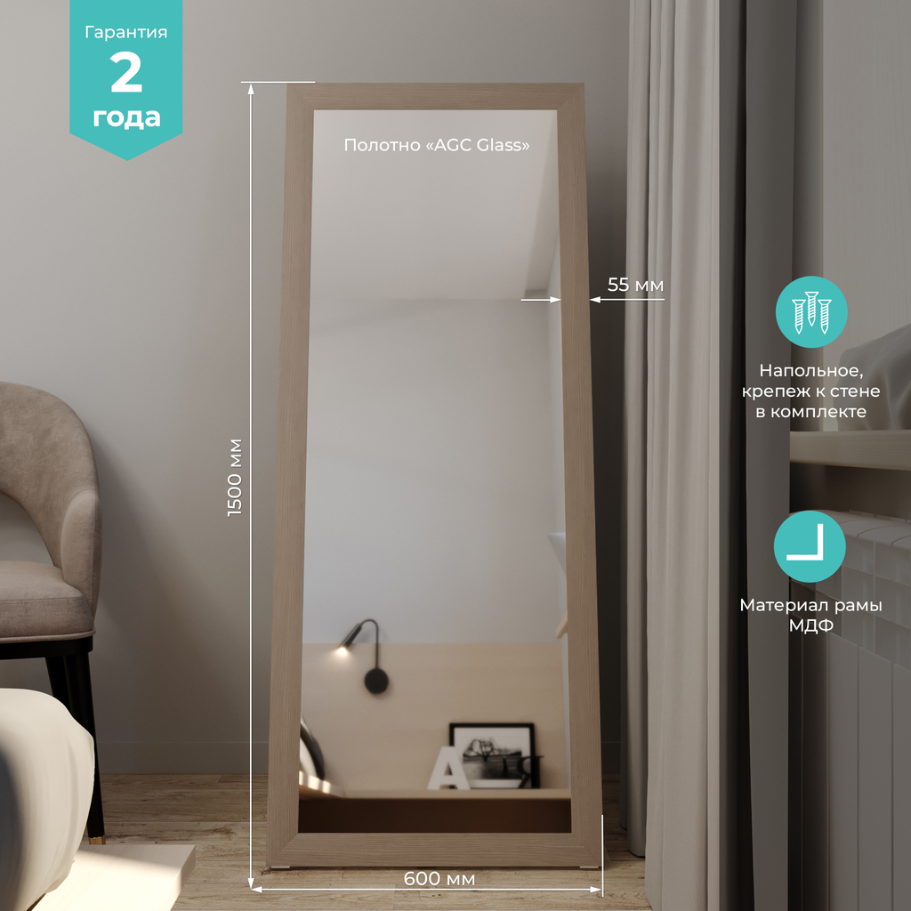 Напольное зеркало формата оversize — незаменимый инструмент для преображения пространства. Отражая максимум света и наполняя им помещение, зеркало делает его более просторным. По вашему желанию зеркало может быть размещено как на полу, так и на стене. Оно станет настоящей волшебной палочкой для моделирования небольших комнат — ванной, прихожей, узкого коридора. Модель в багетной раме с эффектом под светлое дерево — беспроигрышный вариант для любого интерьера, от классики до современного стиля. Строгая прямоугольная форма, лаконичное обрамление с имитацией структуры дерева соответствуют тренду на визуальную простоту и натуральность. В то же время багет в любом, даже самом простом исполнении всегда привносит в интерьер нотку изысканности.Сертификаты, декларации и паспорта товаров TIM