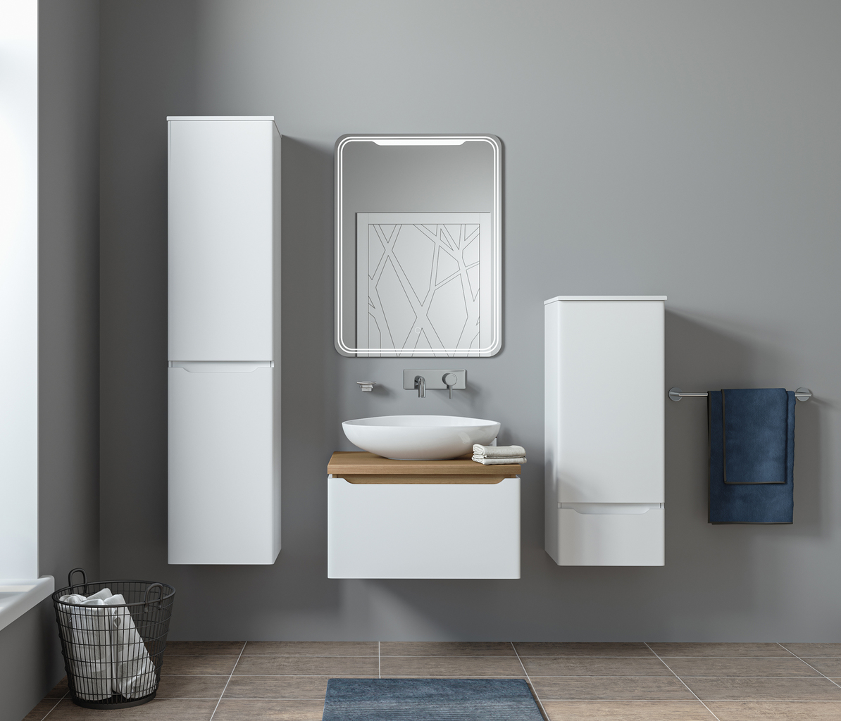 Зеркало Виктория или зеркальный шкаф со светодиодной подсветкой и сенсорным выключателем создают единый гармоничный ансамбль с минималистичной мебелью тм Mixline.