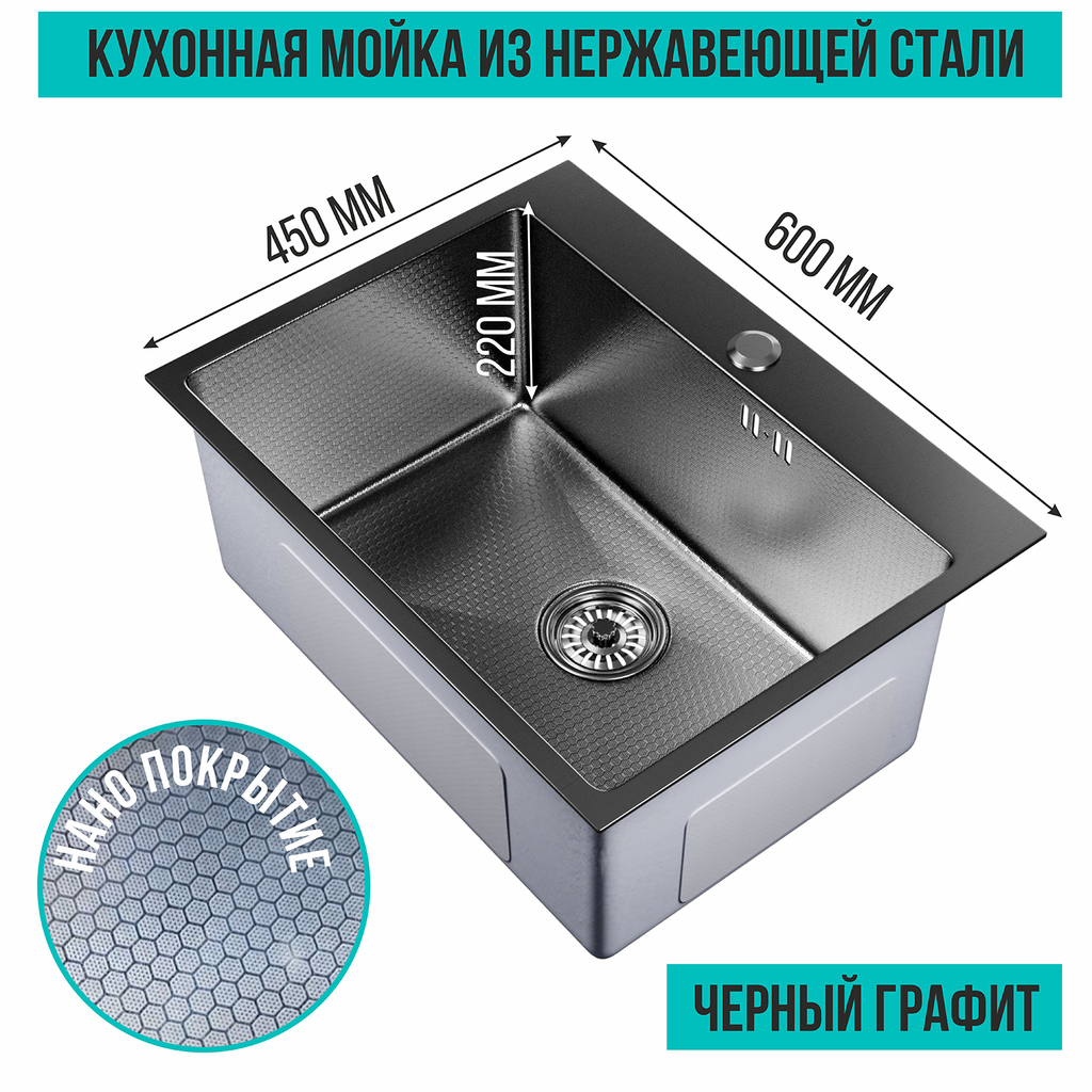 Мойка настол.монтаж 60х45 (3,0) вып 3 1/2 MIXLINE PRO 22см с сифоном (черный графит НАНО декор)