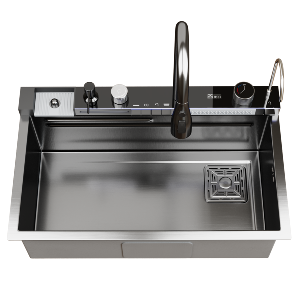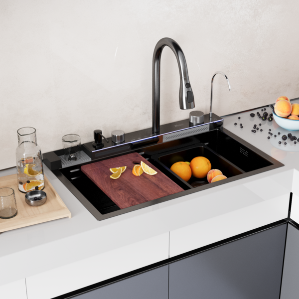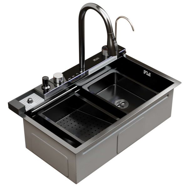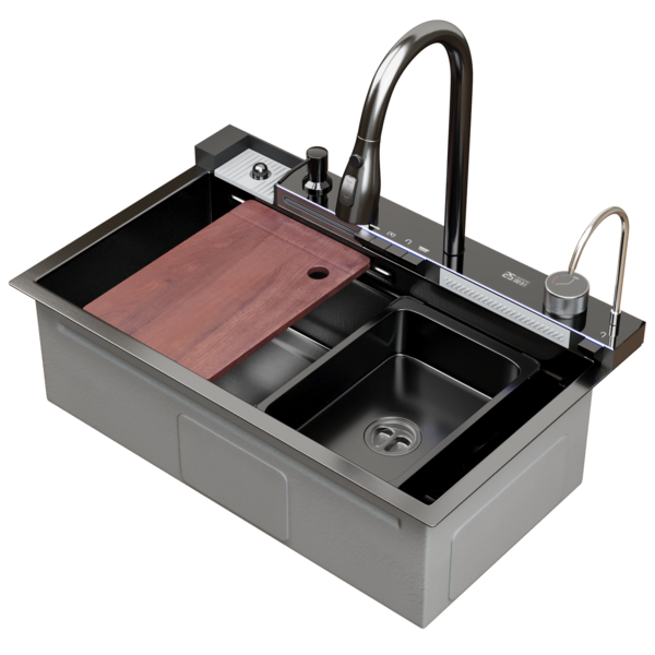 Комплектация мойки: смеситель с выдвижным изливом и возможностью переключения режимов струя/душ, встраиваемый дозатор мыла, разделочная доска, ополаскиватель стаканов, металлический коландер со сливом, металлический коландер с перфорированным дном, сифон.