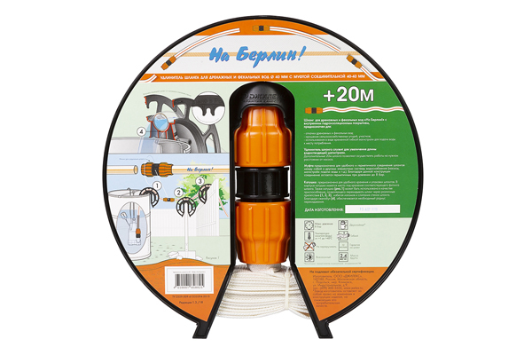 Фитинг герметично соединяет шланг и удлинитель между собой и c другими элементами системы водоснабжения (насосы, магистрали подачи воды и т.д.). Катушка обеспечивает удобное хранение удлинителя.