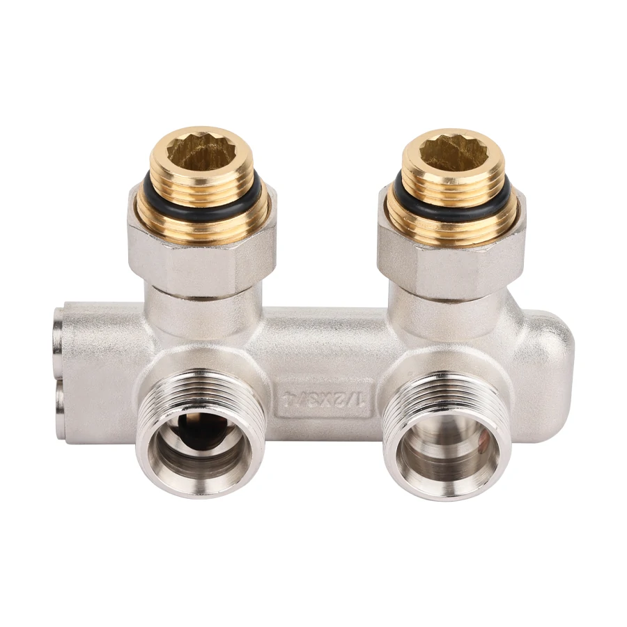 Узел угловой перекрёстный НВ радиаторный со встроенными запорными вентилями, с ниппелями 1/2*3/4Е