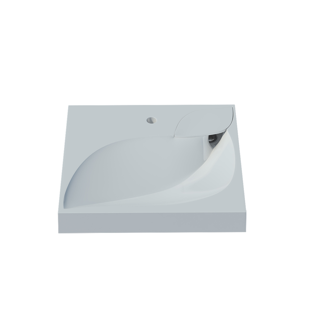 Изделие имеет чашу оригинального листовидного дизайна, а отверстие слива изысканно спрятано под съемной мыльницей.
