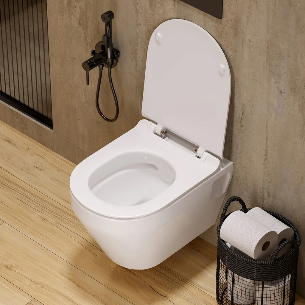 Подвесной унитаз «Novel». Безободковая чаша и ультратонкое сиденье с функцией плавного опускания. Благодаря лаконичному дизайну модель легко впишется в любой интерьер, сохраняя безупречную функциональность. Размеры: 365 x 508 x 374