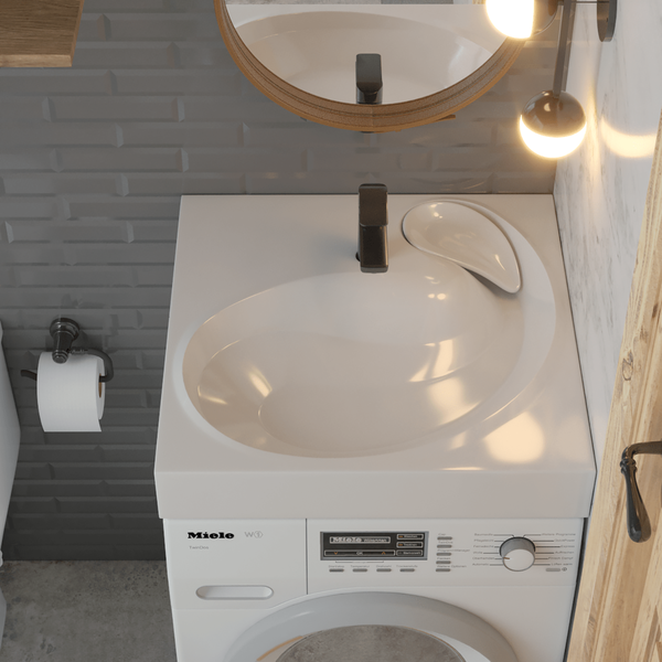 Раковина для установки над стиральной машиной «Buta» сочетает в себе плавность форми элегантность линий. Эстетический и практичный дизайн подойдёт для любого интерьера