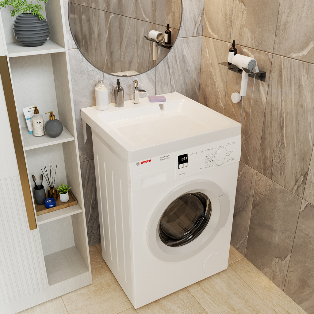 Умывальник "ЛАЙН" для установки над стиральной машиной станет верным решением для оптимизации площади небольшой ванной комнаты.Компактная конструкция из умывальника и стиральной машины сэкономит свободное пространство и избавит от необходимости размещения бытовой техники в неудобном месте.