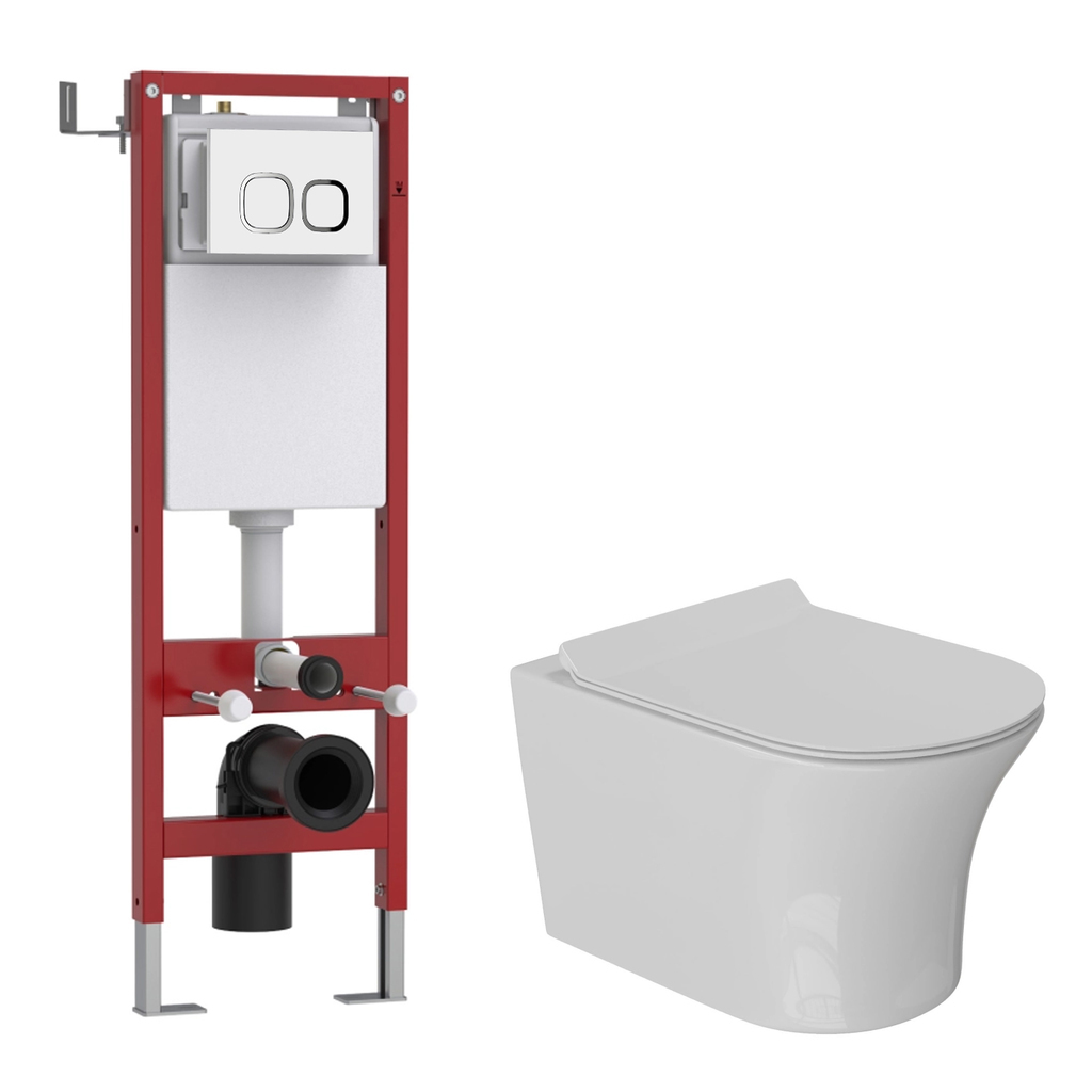 Полностью готовый для установки комплект WAVE состоит из системы инсталляции, двухрежимной кнопки с механической системой запуска смыва, безободкового унитаза "STAR". В комплектацию входит все необходимое для установки: крепления, патрубки, звукоизолирующая пластина.Ширина инсталляции составляет 380 мм.