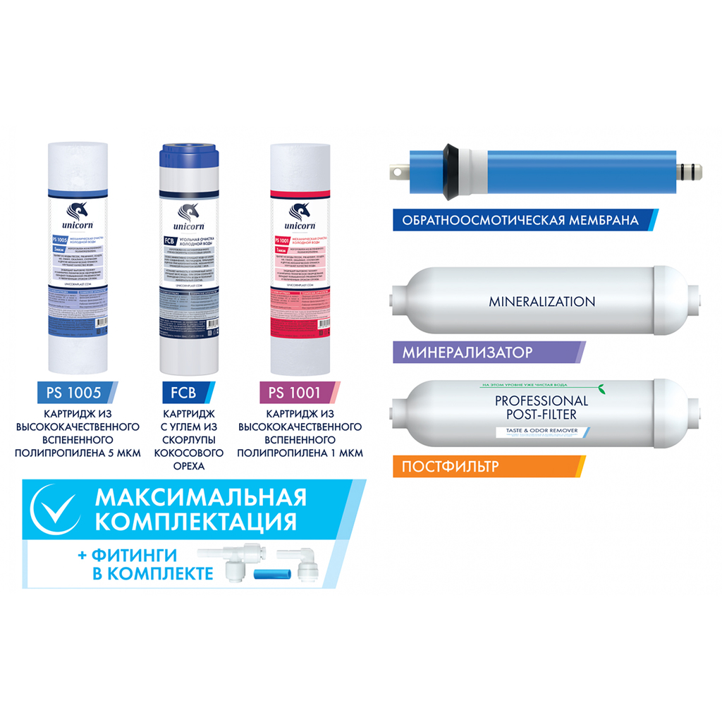 Набор для осмоса KCB-FRO-6, кроме картриджей аналогичных комплекту KCB-FRO-5, дополнен минерализатором, который обогащает воду необходимыми человеческому организму минералами и микроэлементами (кальций, магний, натрий и пр.).
