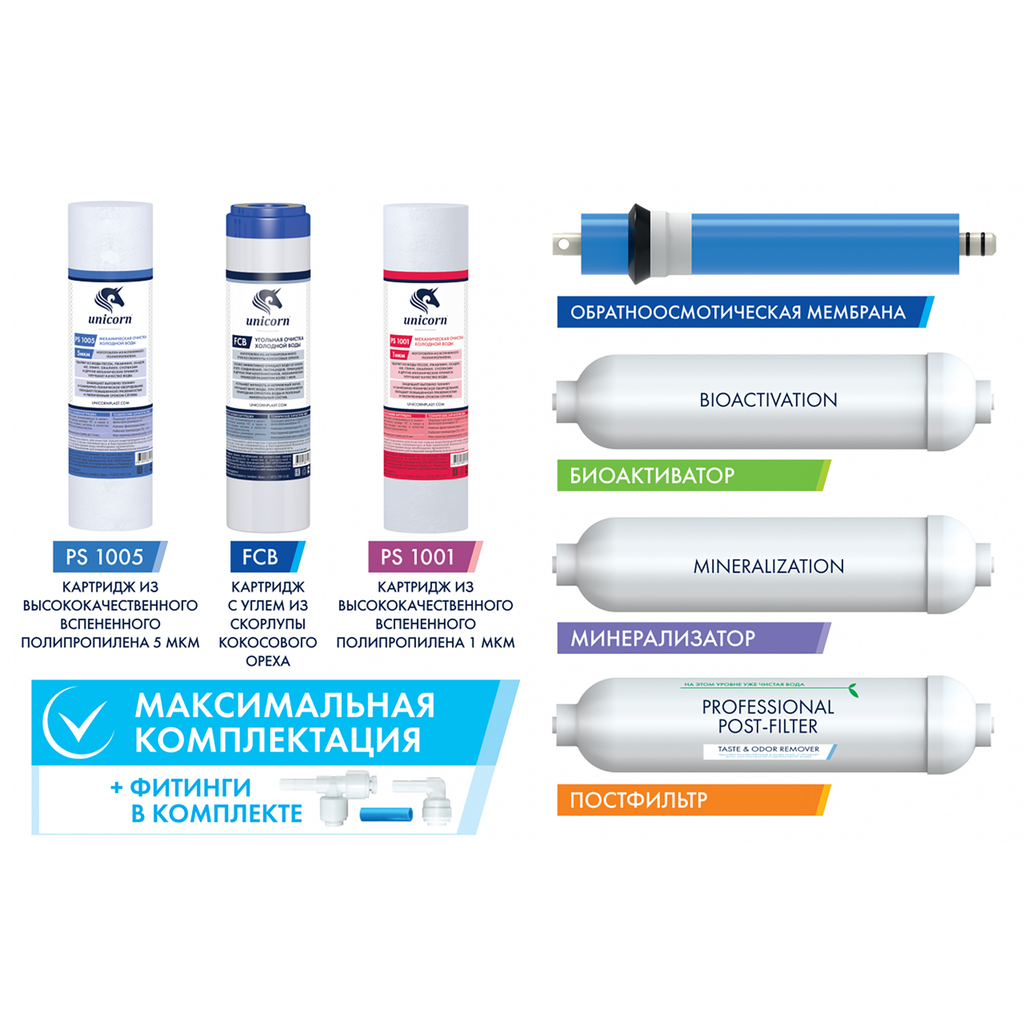 Набор для осмоса KCB-FRO-7 так же дополнен минерализатором, который обогащает воду необходимыми человеческому организму минералами и микроэлементами (кальций, магний, натрий и пр.) и включает в себя еще и биоактиватор, который активирует кластеры воды, делая ее биологически активной, восстанавливая ее природную структуру.