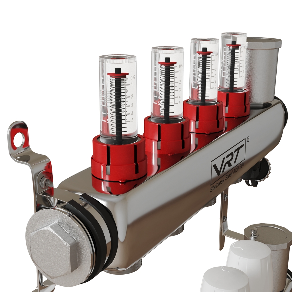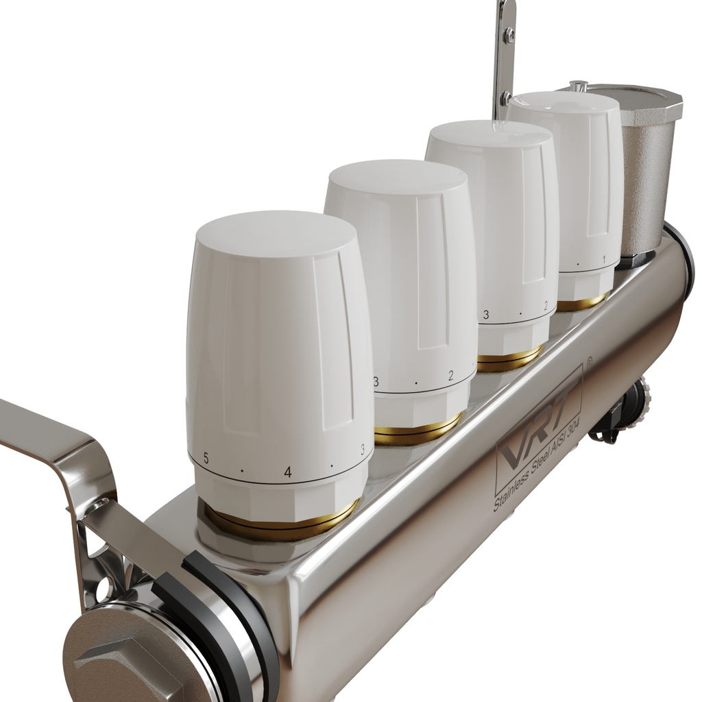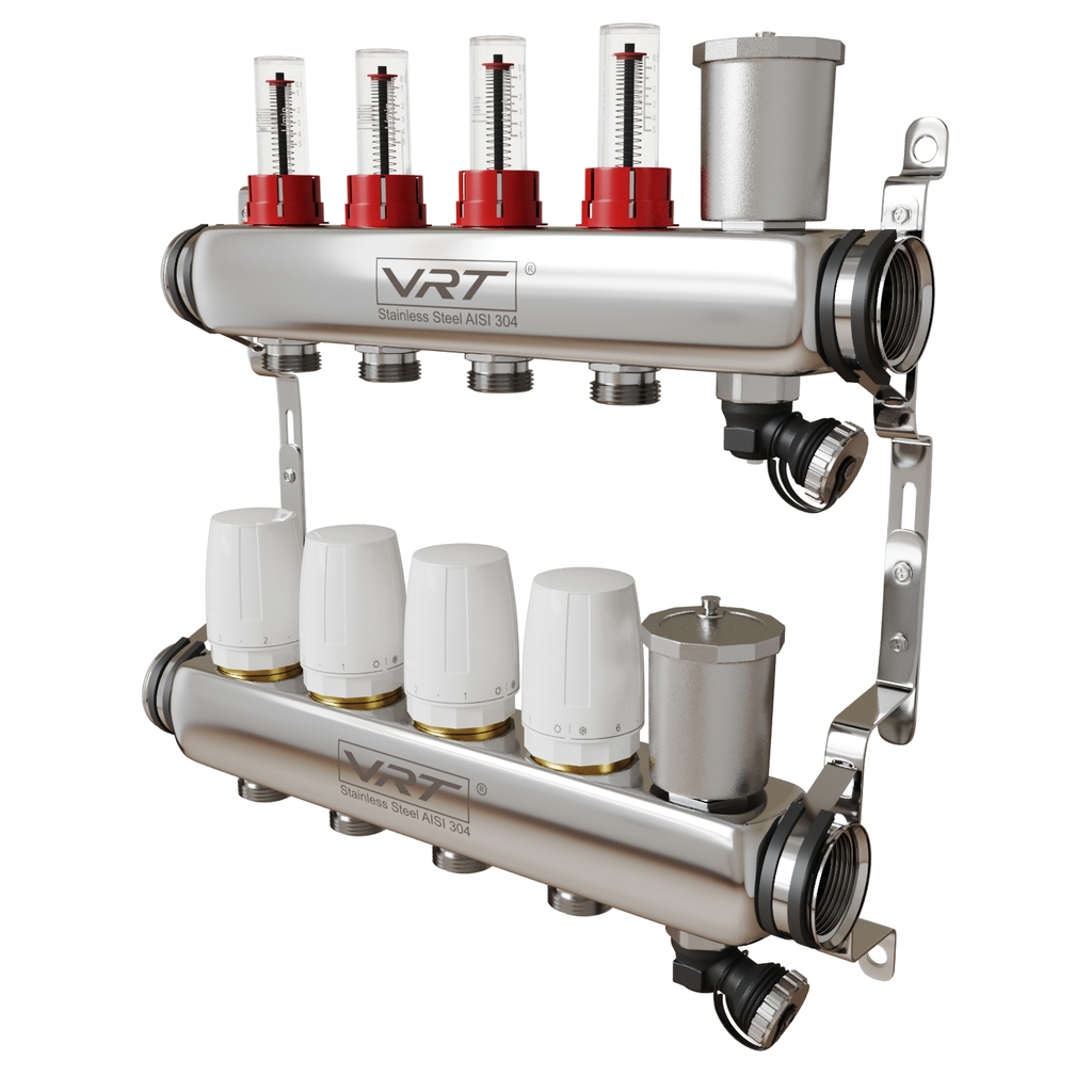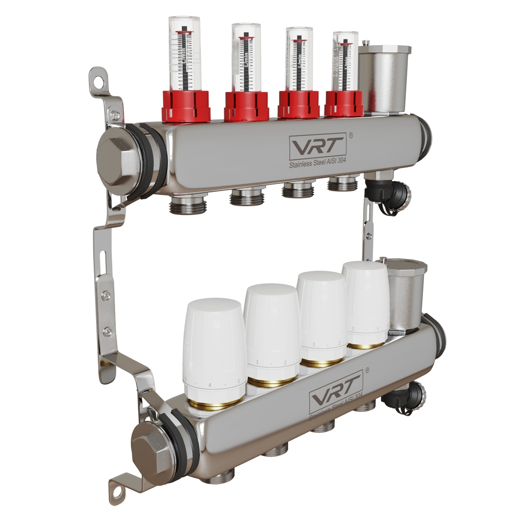 Коллекторные группы VRT являются распределительным изделием, посредством которого теплоноситель распределяется в контурах системы отопления, а также с ее помощью происходит балансировка контуров, перекрытие потоков, удаление воздуха из рабочей жидкости, слив теплоносителя.