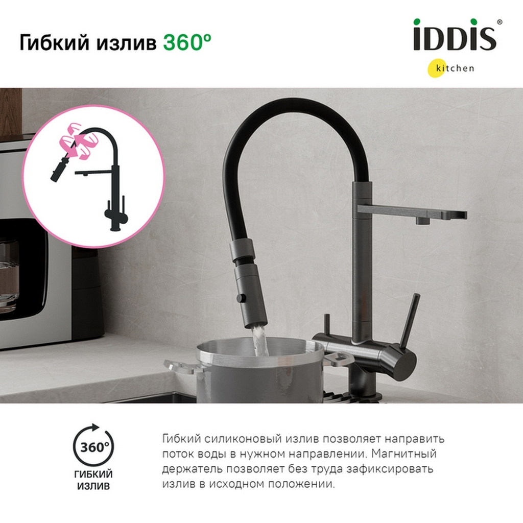 Смеситель для кухни 35к IDDIS ACEGMFFi05 "Ace" высокий, 3 в1, вых. д/пит. фильтра, душ ГРАФИТ