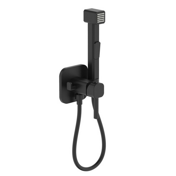 Встраиваемый смеситель с гигиеническим душем в стильном черном матовом исполнении станет отличным дополнением современной ванной комнаты, привнесет в нее комфорт и эстетику. Имеет крючок для полотенца. Крючок и держатель для лейки при необходимости можно поменять местами. Смеситель экономит пространство и упрощает уборку — благодаря скрытому монтажу в стену и отсутствию больших выступающих элементов конструкции.Гигиеническая лейка и гладкий душевой шланг длиной 1,2 метра в комплекте.