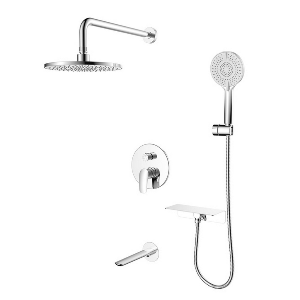 • В комплекте есть все, что нужно, чтобы начать пользоваться сразу: ПВХ-шланг (1,5 м), четырехрежимная ручная лейка, тропический душ и выход для шланга, оснащенный полочкой для размещения косметических средств.