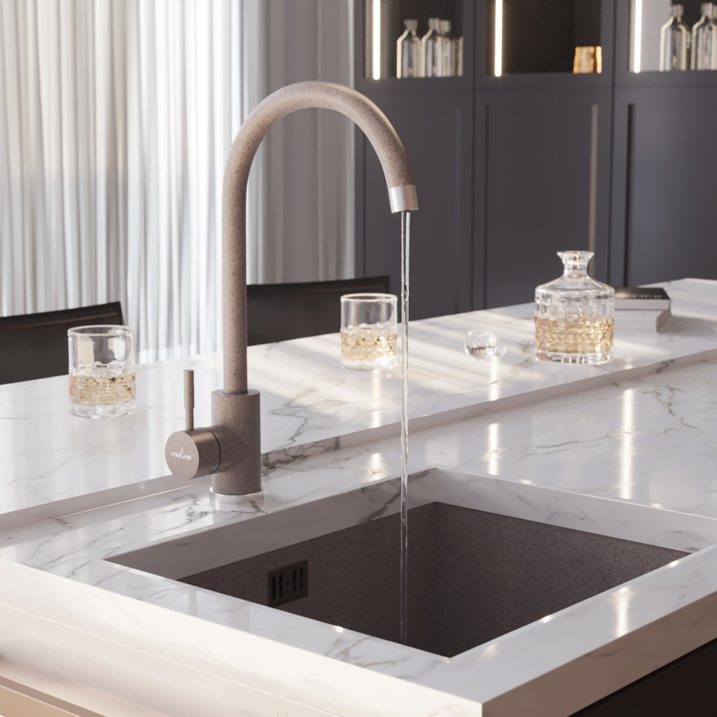 Отличным решением дизайна вашей кухни станет гармоничное сочетание смесителя с покрытием под камень и мойки ТМ Mixline из искусственного мрамора.