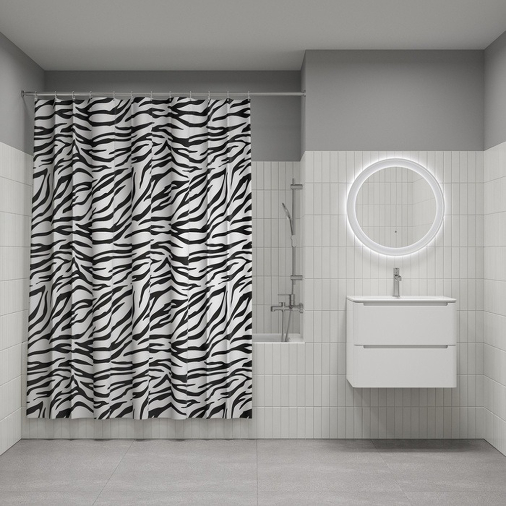 Текстильная штора для ванной комнаты в современном стиле изготовлена из 100%-го полиэстера с водоотталкивающей пропиткой.Штора поставляется в комплекте с кольцами (12шт).