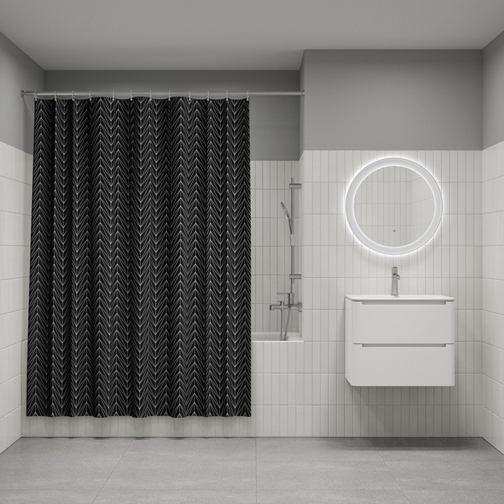 Текстильная штора для ванной комнаты в современном стиле изготовлена из 100%-го полиэстера с водоотталкивающей пропиткой.Штора поставляется в комплекте с кольцами (12шт).