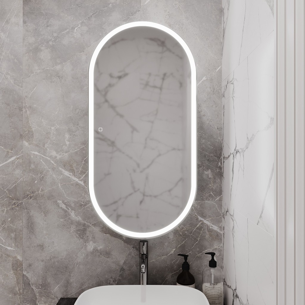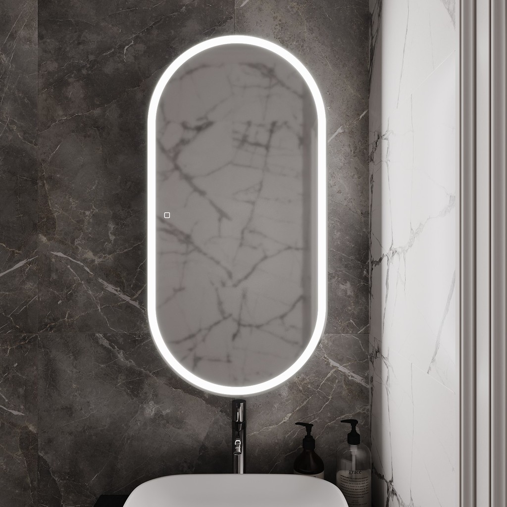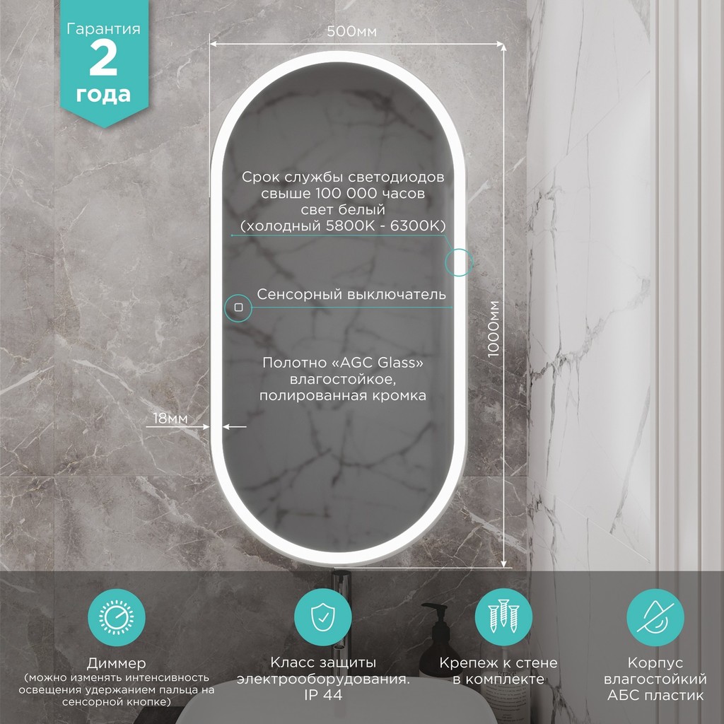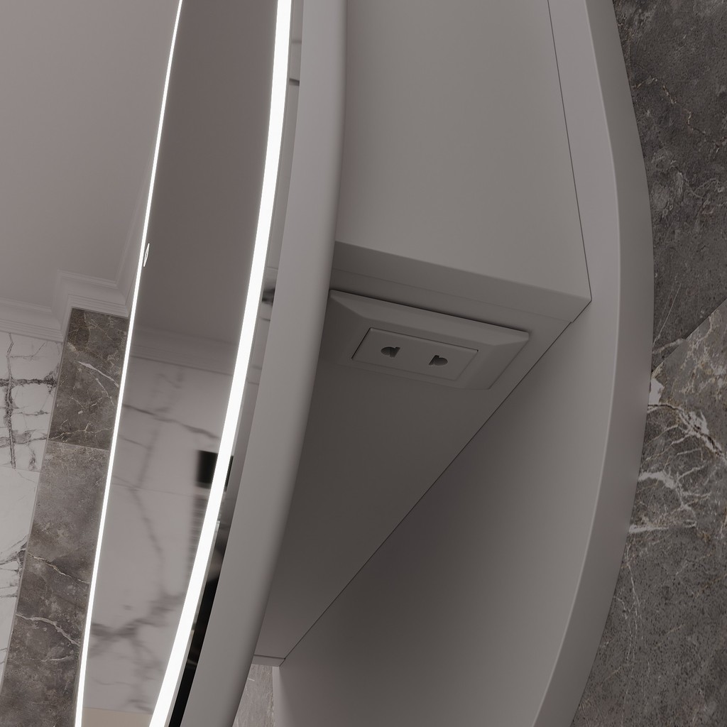 В качестве элемента подсветки используется светодиодная лента, которая обеспечивает яркое свечение по периметру зеркала. Срок службы диодов - 100 000 часов. Свет белый (холодный 5800К - 6300К).