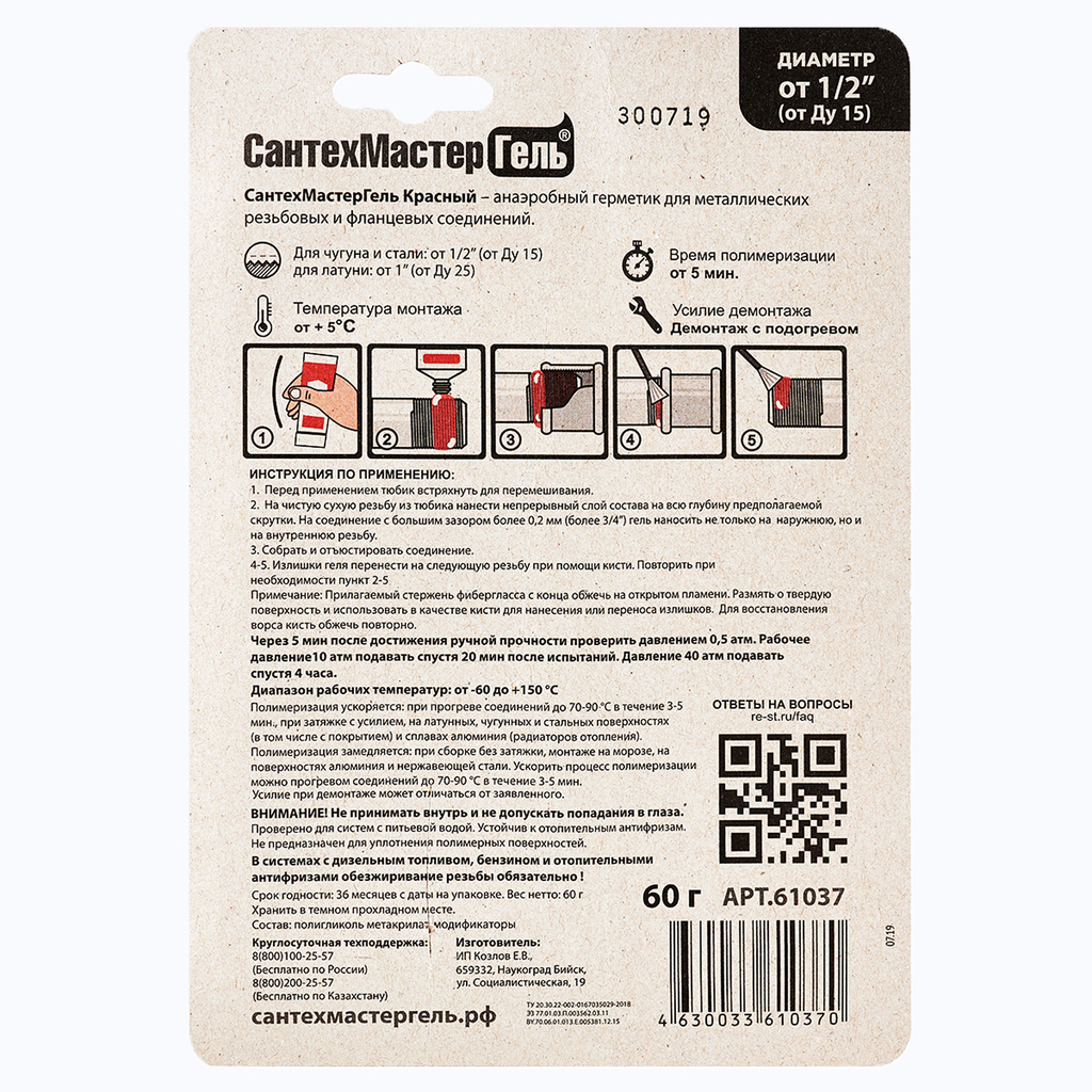 Красный Сантехмастер Гель для чугуна и стали используется для соединения труб диаметром от 1/2 дюймов. Герметизация с помощью этого геля-герметика настолько сильная, что при демонтаже соединение приходится подогревать. Состав рекомендуется использовать там, где необходим срочный запуск системы (общее время полимеризации геля не превышает 5 минут) при температуре окружающей среды от + 5 °C. Ближайшие конкуренты позволяют работать со своими анаэробными герметиками при температуре от + 15 °C.