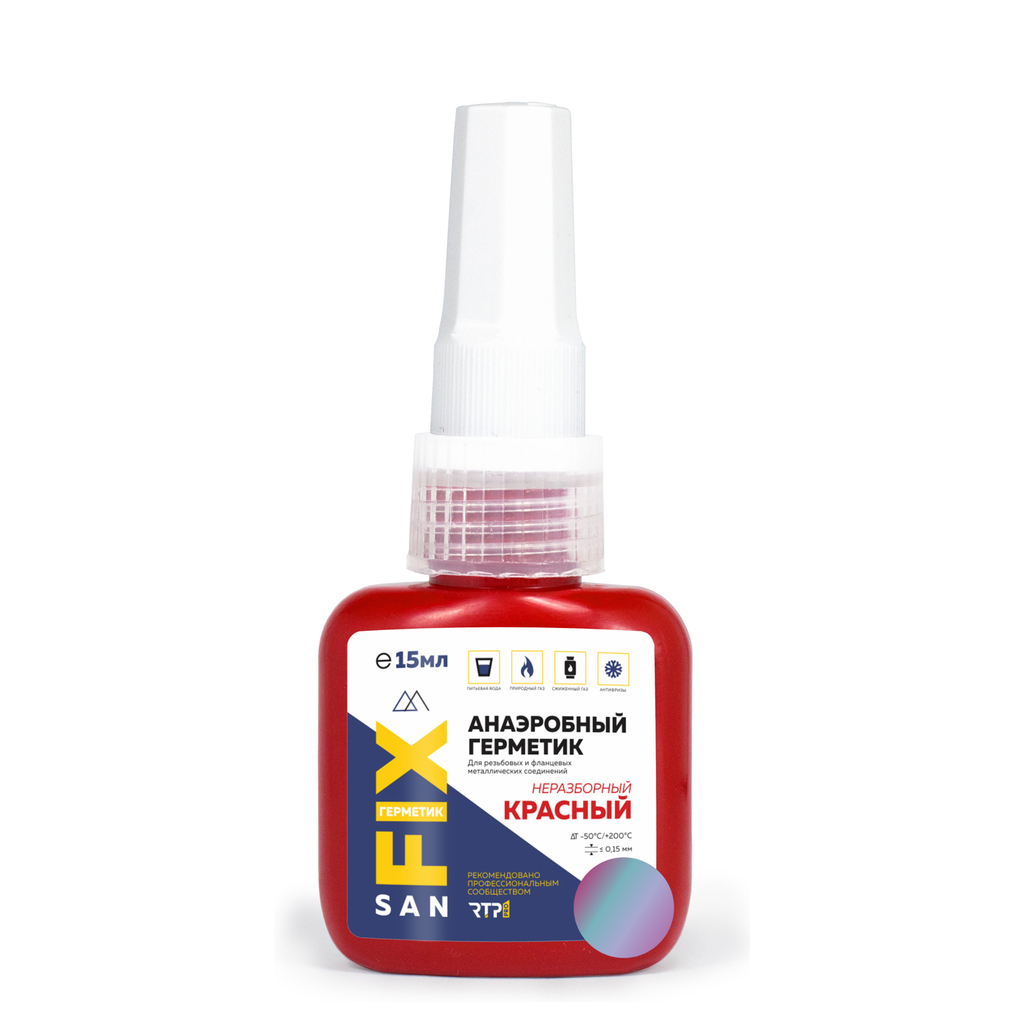 Герметик анаэробный 15мл, красный ТМ SANFIX (резьбовой уплотнитель для неразборных соединений) – жидкое полимерное вещество, применяемое для герметизации металлических резьбовых соединений. Попадая в узкое безвоздушное пространство при соприкосновении с металлом материал полимеризуется (затвердевает), полностью перекрывая собой имеющееся свободное пространство внутри узла.