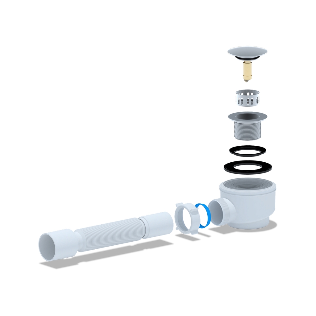 Комплектация: сифон с выпуском клик-клак с сеткой, гофротруба 40х50 мм, упаковка.