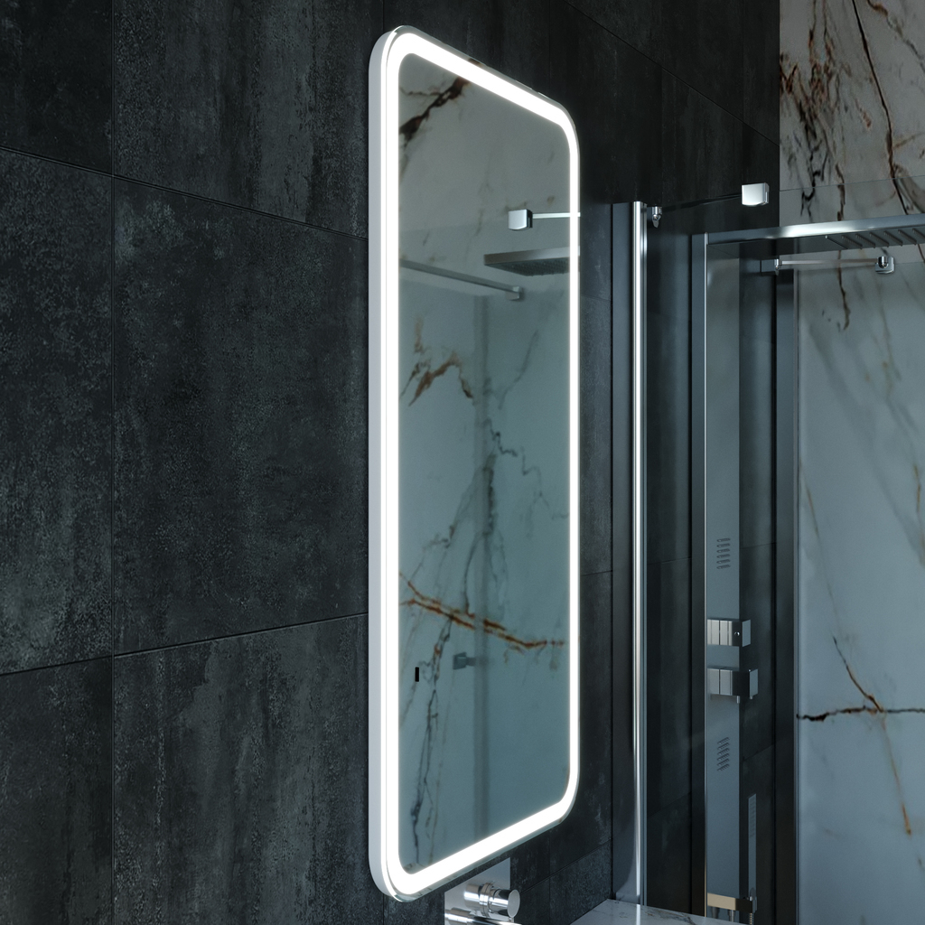 Зеркало локаничного дизайна с фронтальной LED-подсветкой и возможность монтажа как вертикально, так и горизонтально, оснощённое бесконтактным сенсором. Световая рама расположена не по краям периметра, а несколько отступает от него. Графичность рисунка и всей формы смягчают скруглённые углы. Благодаря этой находке довольно минималистичный дизайн не мешает этому зеркалу быть яркой акцентной деталью любого пространства: от строгой, упорядоченной классики и сдержанного минимализма до свободолюбивых эклектичных интерьеров.