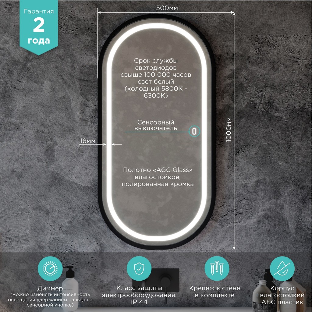 Отличается гармоничностью форм и современным дизайном. Зеркало оснащено сенсорным выключателем с функцией диммера, что позволяет регулировать освещение от более яркого к более приглушенному. Свет зеркала - белый (холодный 5800-6300К). Срок службы диодов - более 100 000 часов.